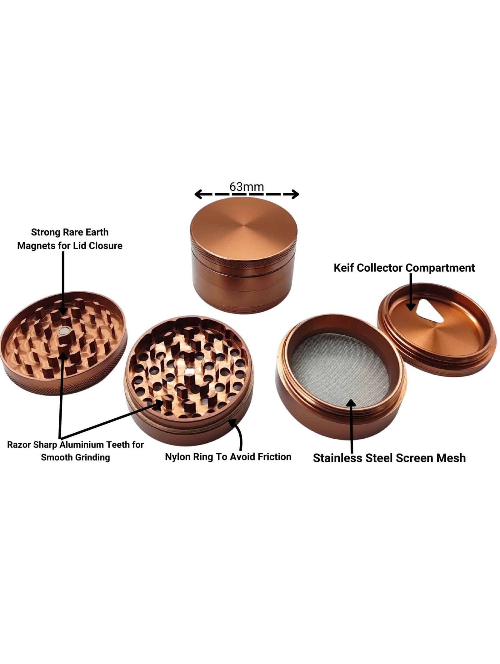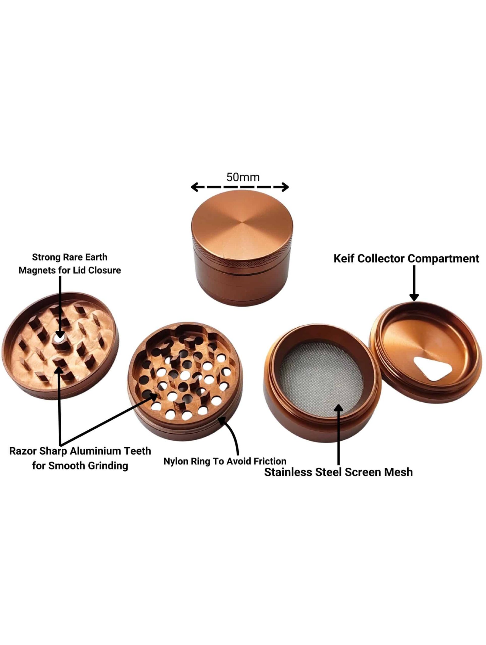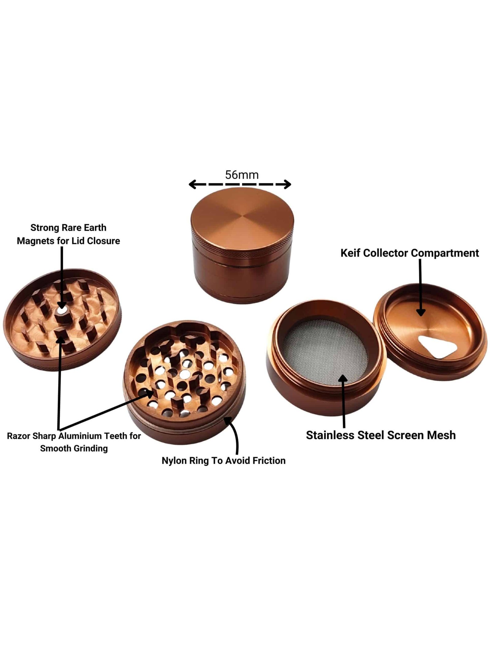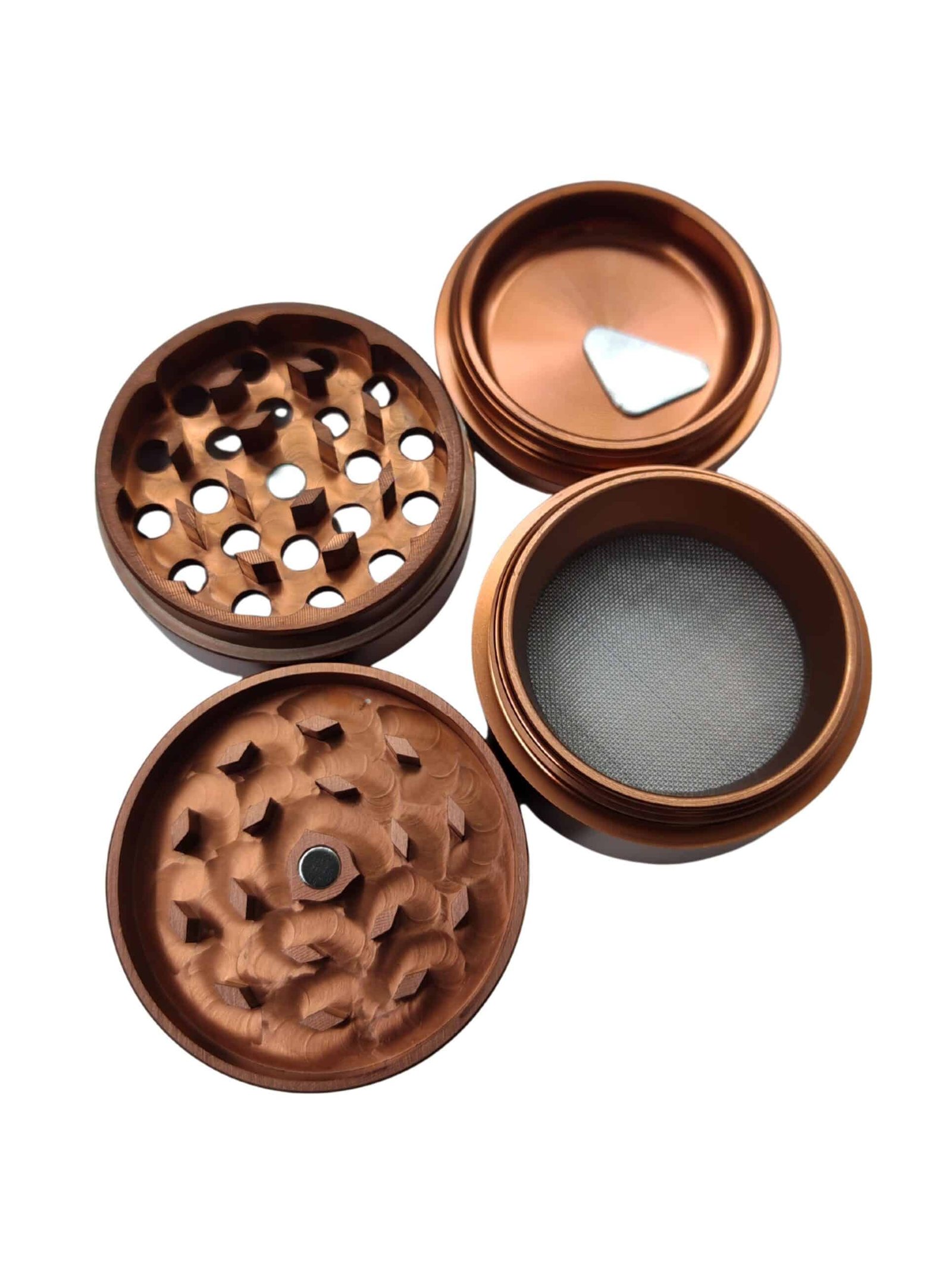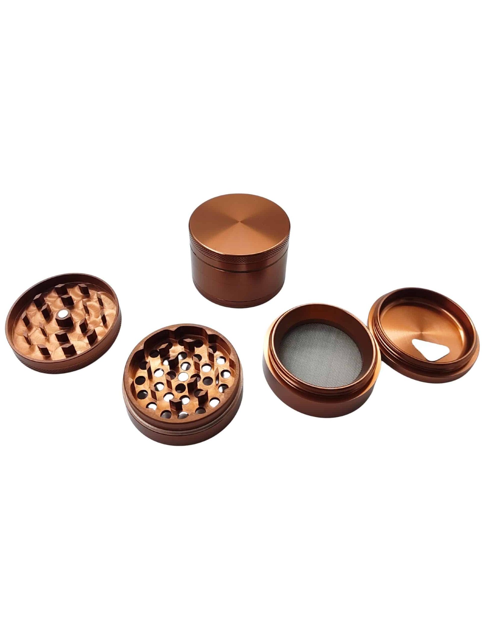 Upgrade your grinding experience with our premium 4-part herb grinder, precision-crafted from aircraft-grade aluminium using advanced CNC machining. Designed for durability and smooth performance, it features a sleek bronze anodized finish for a stylish and long-lasting look. The multi-chamber design ensures efficient grinding, filtering, and collection. Available in three convenient sizes – 50mm, 56mm, and 63mm – to suit your needs.